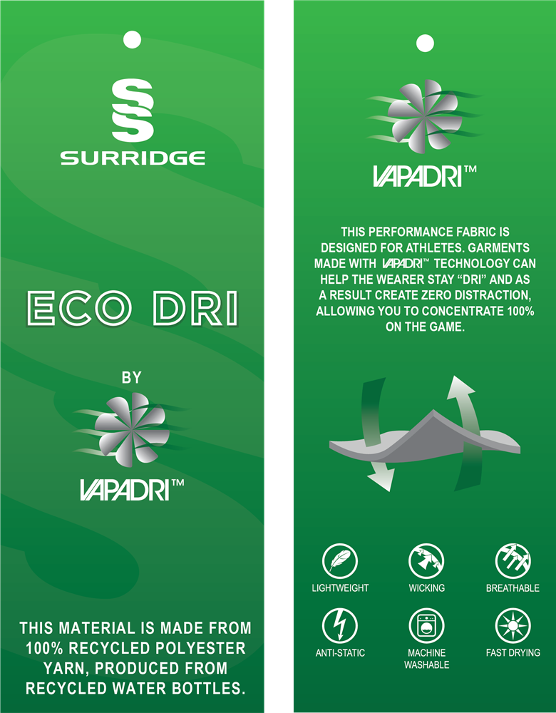 ECODRI is an exclusive range of materials made with VAPADRI technology for Surridge Sport and other major sports brands. EcoDri is a 100% recycled material that is used in the dye sublimated process for most playing garments. Surridge Sport can offer an Eco Dri material for all playing garments. At the moment the offering of the different textures is limited, but as the popularity increases and prices reduce then we are sure the different options will increase.